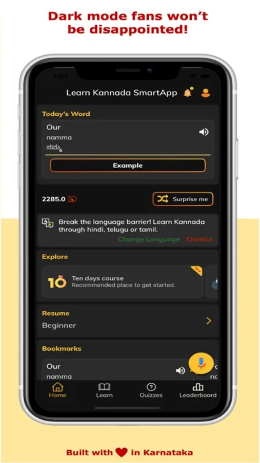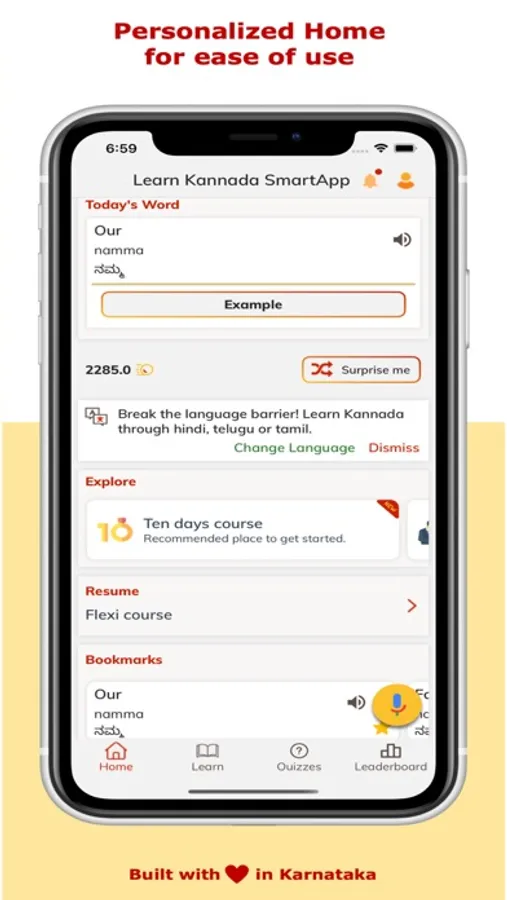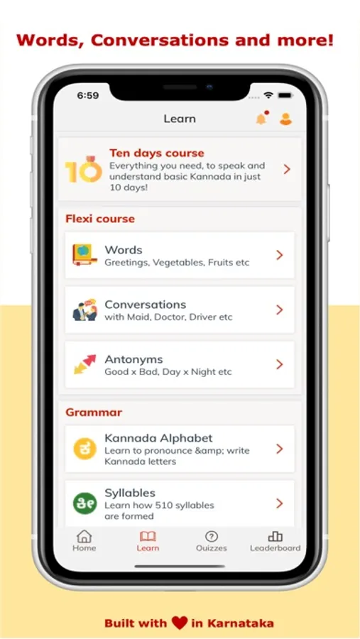1. Ten Days Course: The app started with this and is still the best when it comes to helping you learn the Kannada language in the shortest duration possible. The Ten Days Course was designed to keep basic words that we need in real-life and every word in the course comes with pronunciation and also an example statement to understand the word's usage.