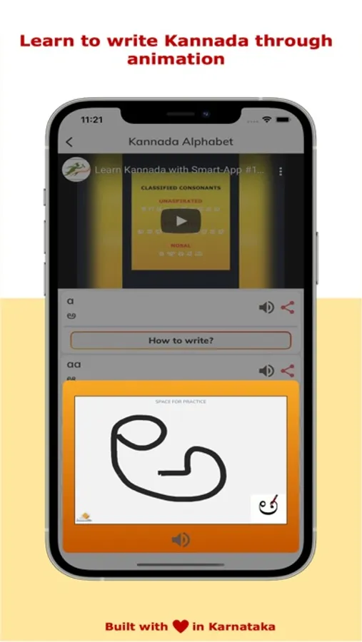 Learn Kannada SmartApp is the world's no.1 Kannada learning app built by Varun A M to help people learn the Kannada language. The app lets you learn spoken Kannada through real-time example conversations and also lets you learn how to write Kannada letters through animations. The app was first built by two people and launched in 2017. However, after receiving huge demand from people that this app is required on iOS devices also, the new app was developed and first launched on App Store in 2021. The app is currently the no.1 Kannada teaching app on all the platforms.