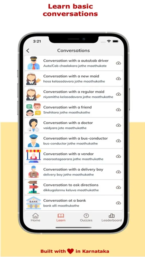 b. Conversations: It's important to learn Conversations to start conversing with people around you and hence there is this feature where you can learn basic real-time conversations like conversations with an auto-driver, conversations with a doctor etc.