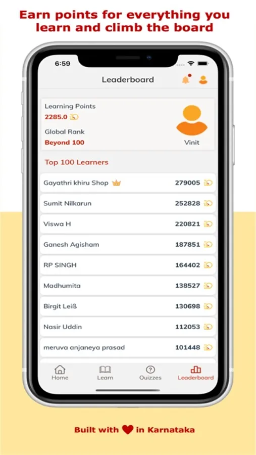 5. Global Leaderboard: Everything you learn on the app is rewarding and every time you learn something or take a quiz, learning points will be rewarded and the top 100 learners globally will be listed on the app's global leaderboard.