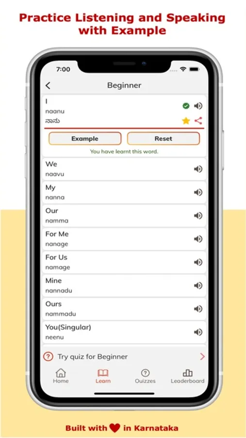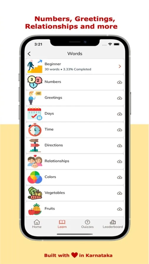 a. Words: Designed especially for those who want to learn Kannada words based on categories like Numbers, Vegetables, Fruits etc. You will be learning hundreds of words here at your own learning pace.