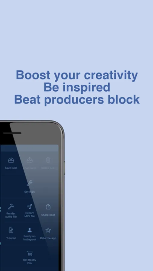 Beatly randomly chooses set of instruments and creates 2 unique bars of looped instrumental music (8 beats). Tempo is chosen automatically, however it can be simply changed. All notes are picked by the algorithm. Each beat can be easily saved and loaded later again.