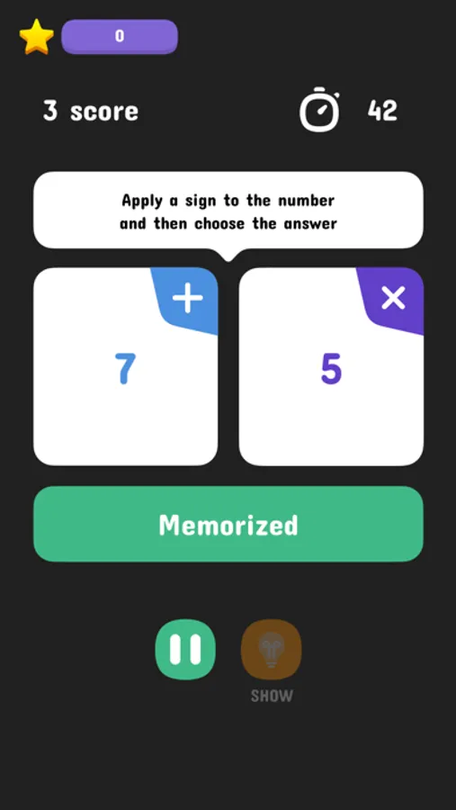 Spectre Mind: Simple Math is a fun free-to-play game for improving your memory. You're given two cards with numbers and math signs (addition, subtraction, division or multiplication) that you have to successively apply to these numbers. These are math equation. Memorize them and calculate the solution. Then choose the right answer. You have limited time to make a decision. Answering correctly gives you more time. Making a mistake reduces you time.