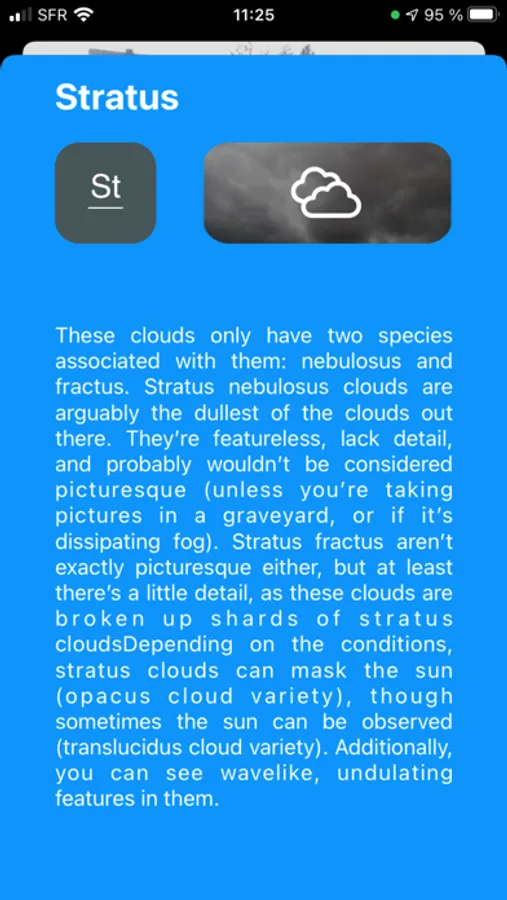 Based on Machine learning among a dataset composed of more than 3 thousand clouds, your iPhone can detect, analyse and identify the main families of clouds. A must have for everyone : kids, students or curious people !