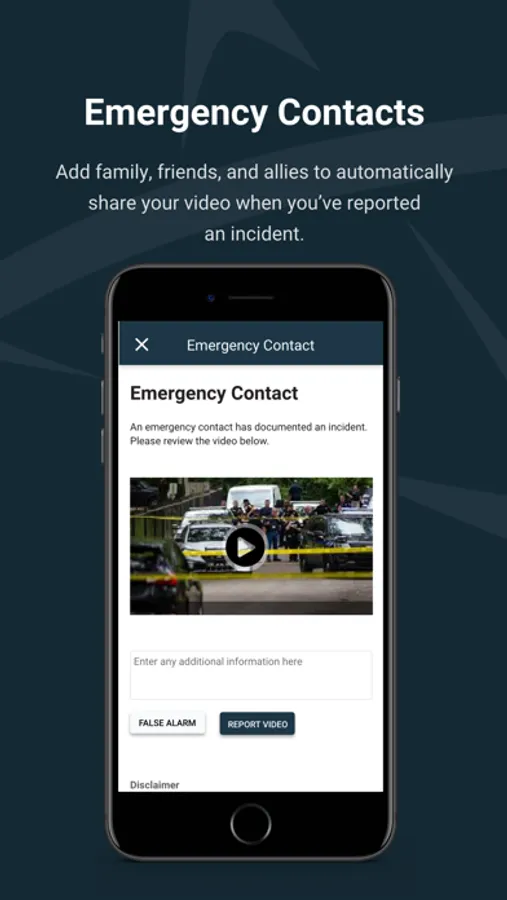 Add up to three Emergency Contacts to get alerts and access to your video feed any time you submit with Bystander.