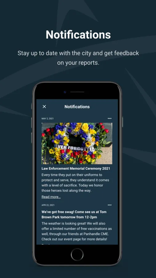 Get emergency alerts and notifications about upcoming events from the city, and get feedback when the city needs to follow up with you.