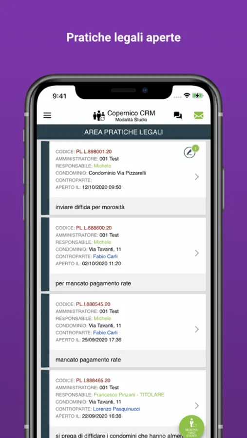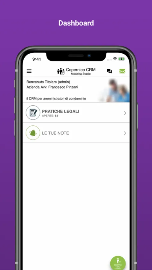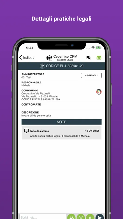 Copernico CRM è una piattaforma WEB che semplifica il lavoro dell'avvocato e velocizza i processi di interazione con lo Studio di Amministrazione. Avrete modo di comunicare direttamente con lo studio tramite l’inserimento di note. Potrete allegare file e foto così da poter velocizzare ed efficientare le comunicazioni relative alla pratiche legali. Un mix bilanciato tra design e funzionalità garantisce una semplice fruibilità della APP. Restando connessi, potrete accedere in ogni momento e ricevere in tempo reale i pop up che vi avvertiranno in caso di inserimento di nuove note.