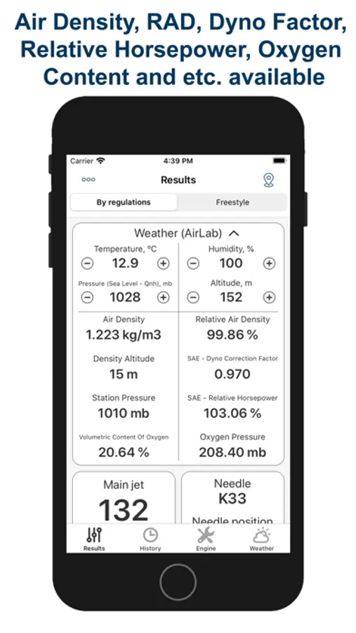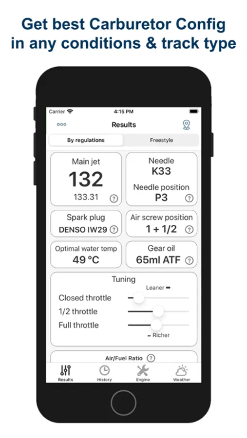 • Results: In this tab two carburetor configs are shown ('By regulation' and 'Freestyle'). These data are calculated depending on the weather conditions and the engine and track configuration given in the next tabs.