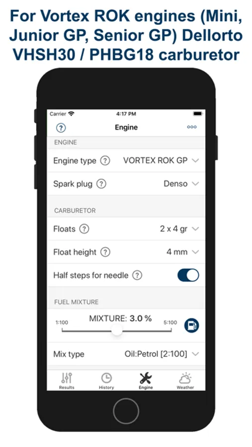 This app provides, using temperature, altitude, humidity, atmospheric pressure and your engine configuration, a recommendation about optimal carburetor configuration (jetting) and spark plug to use for karting Vortex ROK engines (ROK MINI, ROK GP JUNIOR, ROK GP SENIOR), which use a Dellorto VHSH 30 and PHBG 18 carburetor.