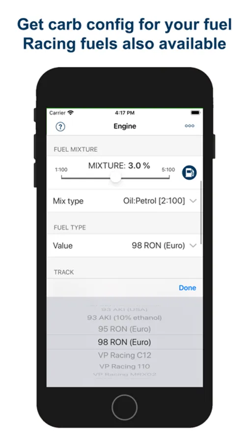 • Mix wizard to get the perfect mix ratio (fuel calculator)
