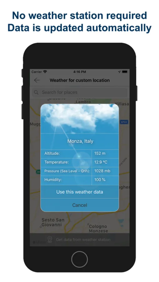 This app can obtain automatically the position and altitude to get the temperature, pressure and humidity from the nearest weather station through the internet. Internal barometer is used on supported devices for better precision. Application can run without GPS, WiFi and internet, in this case the user has to enter weather data manually.