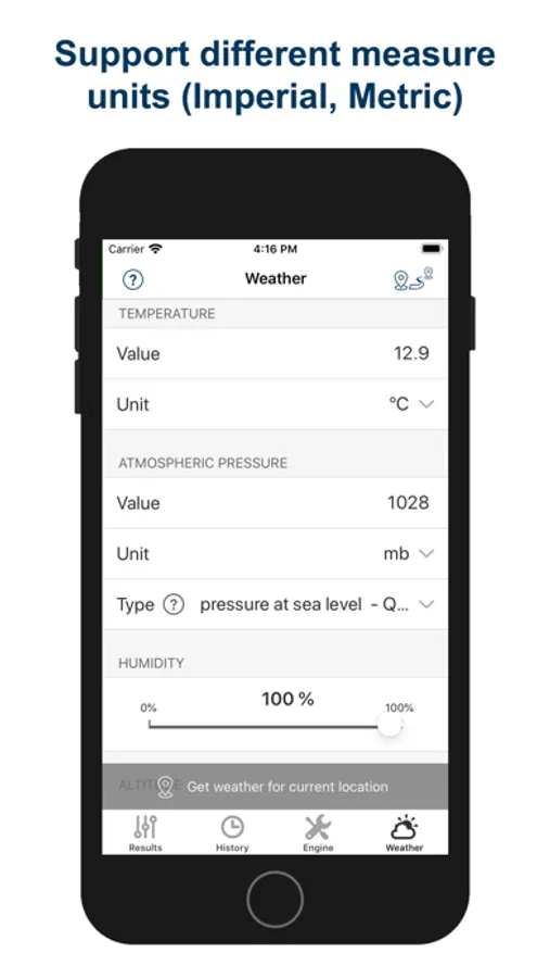 • Weather: In this tab, you can set the values for current temperature, pressure, altitude and humidity. Also this tab allows to use the GPS to get the current position and altitude, and connect to an external service (you can choose one weather data source from several possible) to get the weather conditions of the nearest weather station (temperature, pressure and humidity). In addition, this application can work with a pressure sensor built into the iPhone. You can see if it is available on your device and turn it on or off. Also, on this tab, you can enable alerts about possible carburetor icing.