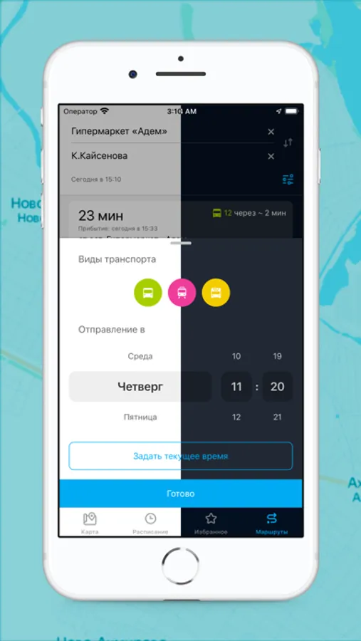 Plan your route using the app, taking into account the types of public transport that are suitable for you - bus, tram and route taxi. To build a route, choose your current location, a bus stop or just a place on the map.