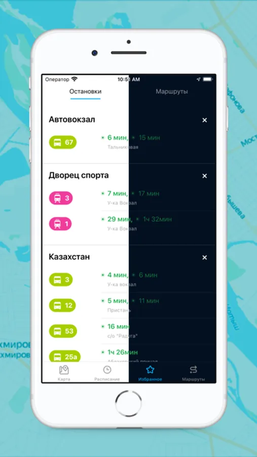 Mark your favorite public transport routes with an asterisk to quickly find them in Favorites. This can be done at any stop. A stop will be added to Favorites if at least one route is marked that passes through this stop. Now you can easily and quickly go to a stop or view the entire route with just one click.