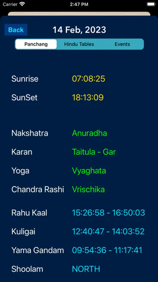 - Shubha/Ashubha kaal like Rahu kaal,Yama Gandom,Kuligai,Shoolam Direction.
