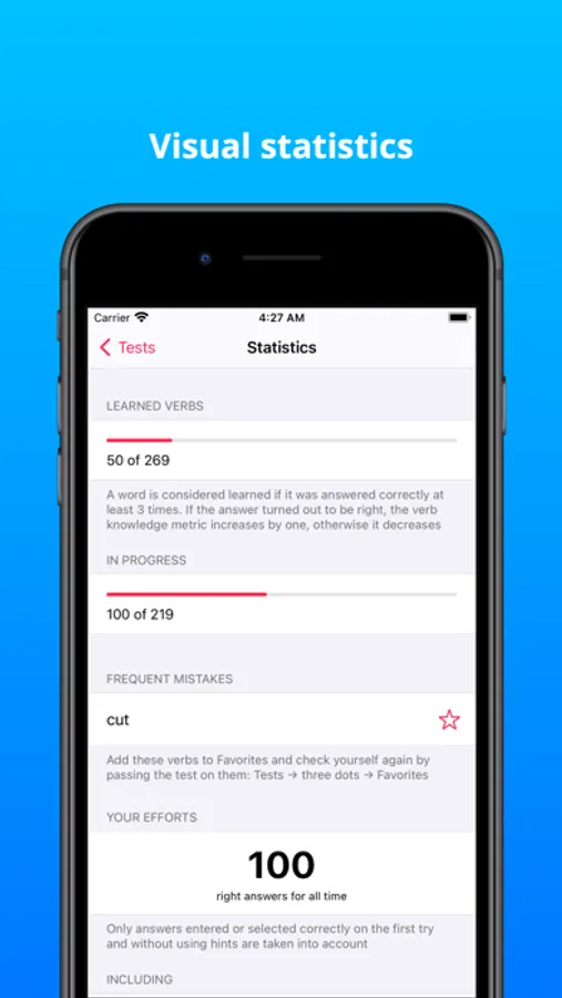 • Statistics showing progress in learning: how many verbs have already been learned, how many are being studied and how many are still left;