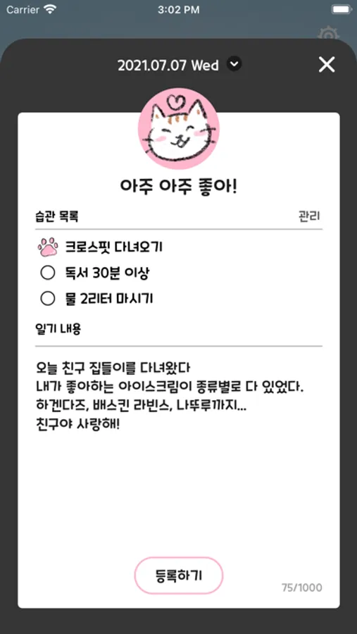 그럴 때는 최대 1000자까지 지원하는 일기 작성 기능을 사용해보세요.