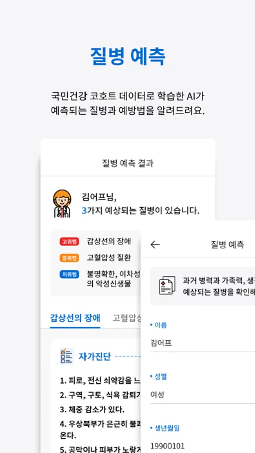 내가 걸릴 확률이 높은 질병이 무엇인지 어프 A.I.가 예측해요.