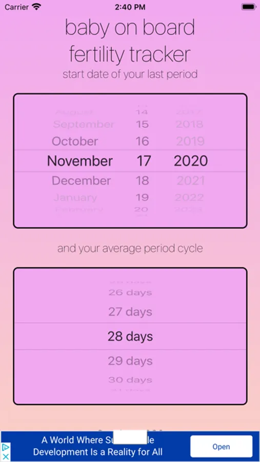 Want a little one? Need to figure out when you're most fertile? This no frills, no BS ovulation tracker does just that. Put in the time of your last period as well as your average time between periods and it'll calculate the three day range of your ovulation. There's nothing more than that. If you want a more complicated tracker -- there's other apps out there to do that. This app is all about keeping it STUPID SIMPLE. Now, go out there, put in your info and get a Baby En Bound!
