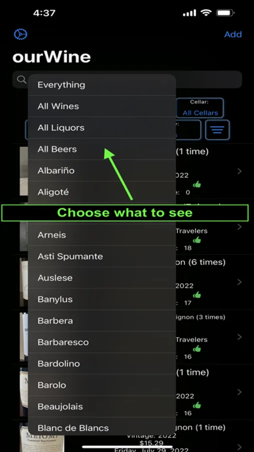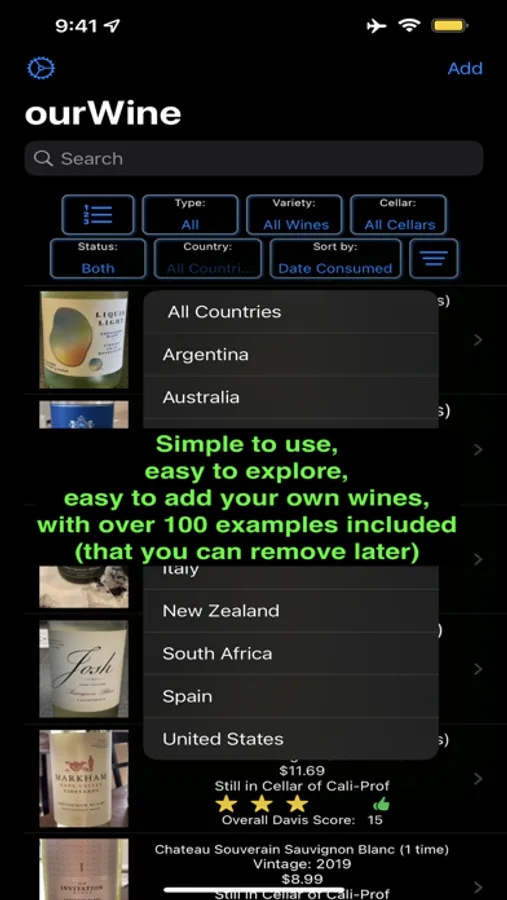 ourWine comes with over 100 example wines to let you play with the App to get familiar with searching, filtering, sorting, and viewing different Cellars. At any time, you can erase the example wines and replace them with your own. Go to “Settings/Archive.”