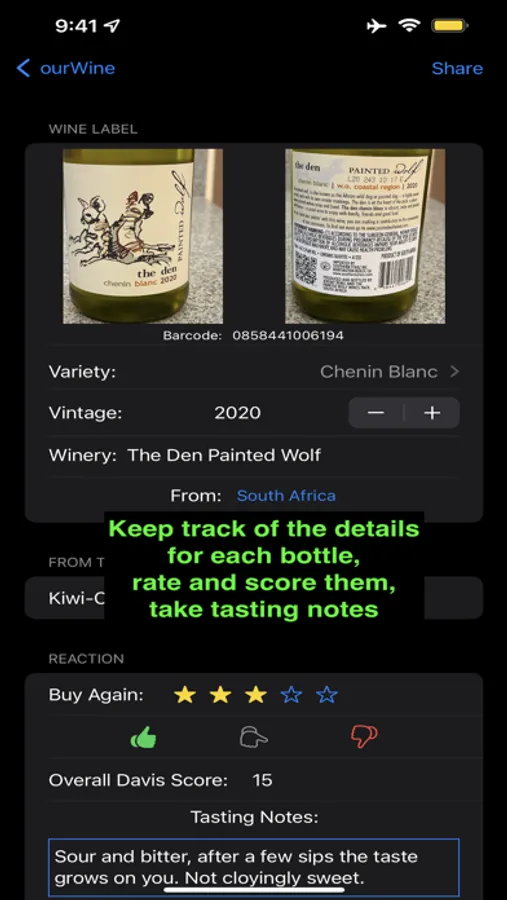 ourWine remembers each bottle separately - because if you have had a wine more than once, there may be times when you want to review and rate it differently.