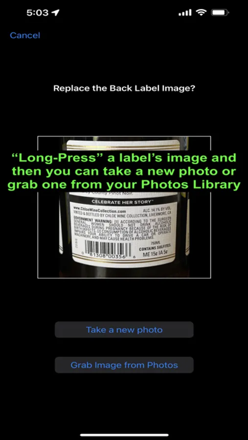 1) Use your iPhone or iPad camera to take pictures of the front and back labels of the wine bottle and “scan” the barcode on the bottle.