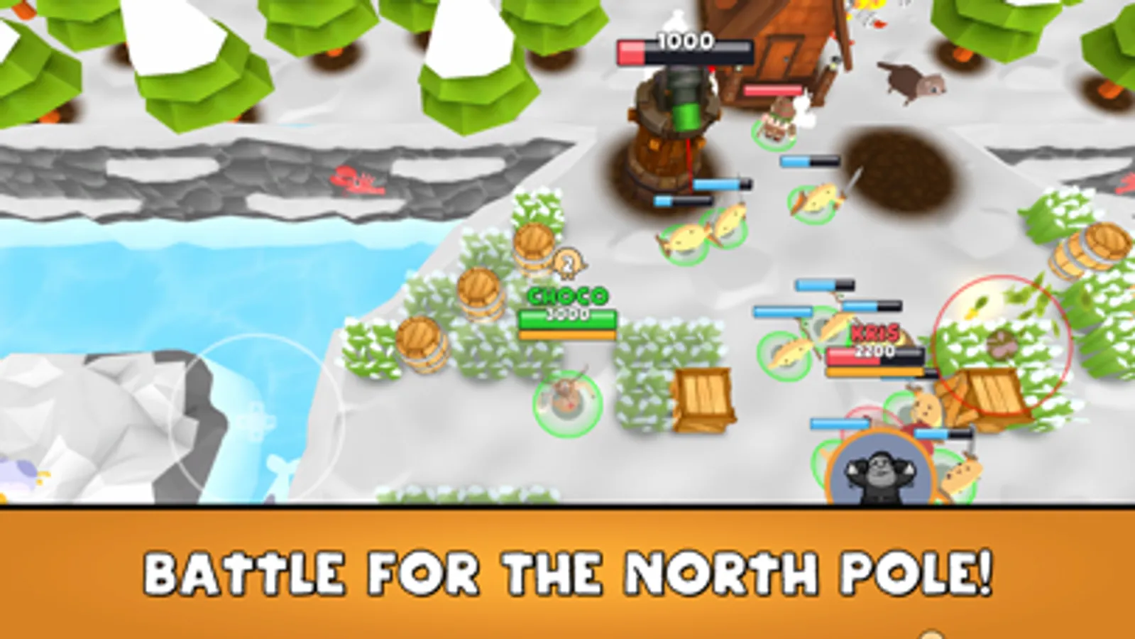 Battle for the North Pole: Fight for Team Cookies or Team Claus to destroy the enemy base. Your team spawns more cookie helpers or elves when you take down enemies!