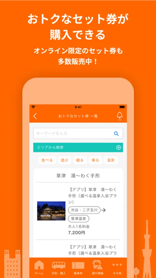 高速バスと他の交通機関や施設がセットになったおトクなセット券を購入できます。オンライン上でクレジット決済ができるため、バス窓口に寄らなくても高速バスにご乗車いただけます。