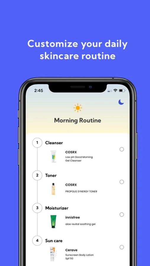 Customize your morning and night time skincare routine to keep track of your skincare progress.