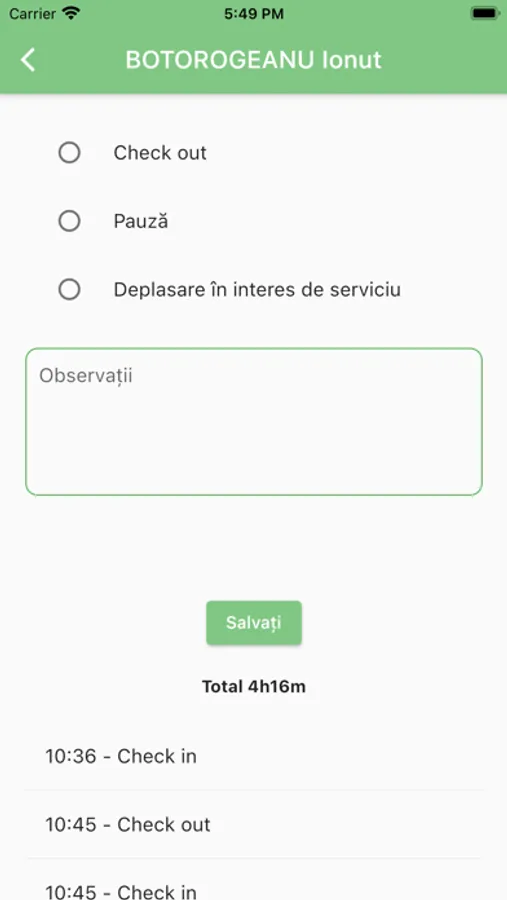 Aplicația permite atât autentificarea pe bază de parola cât și utilizarea badge-ului pentru o pontare rapidă.