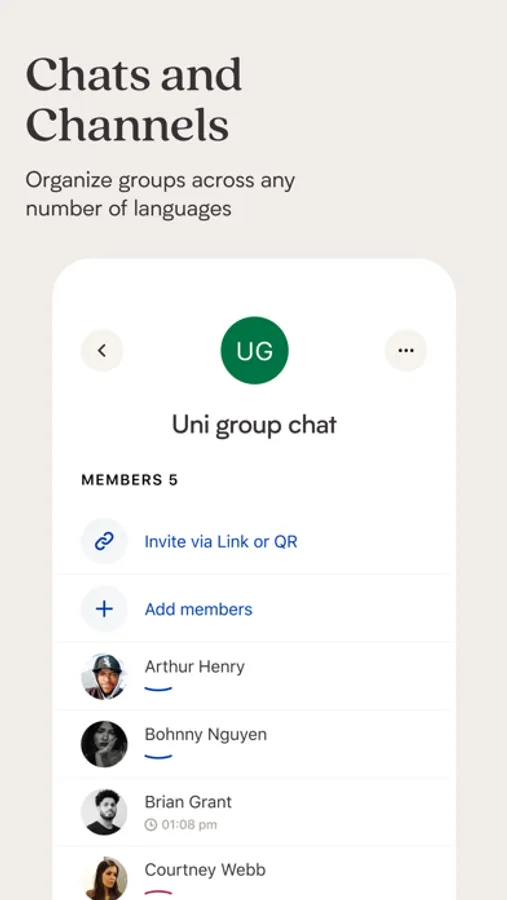 Group chats and channels - Organize groups across any number of languages and collaborate using channels.