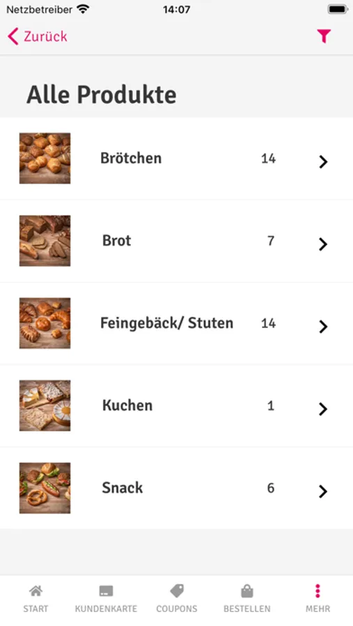 In der App finden Sie ein Grundsortiment, mit zahlreichen Geschmackserlebnissen, die in verschiedene Kategorien gegliedert sind. Von Frühstücksgebäcken über saftige Brote und leckeren Kuchen ist für jeden etwas dabei. Sie können Ihr Lieblingsprodukt in der App bestellen, bezahlen und am gewählten Tag in Ihrer Wunschfiliale abholen. Sie finden hier außerdem alle relevanten Informationen über unsere Produkte. Dazu gehören Artikelbeschreibungen, Nährwerte und Allergene. So müssen auch Allergiker nicht mehr auf Ihren Genuss verzichten.