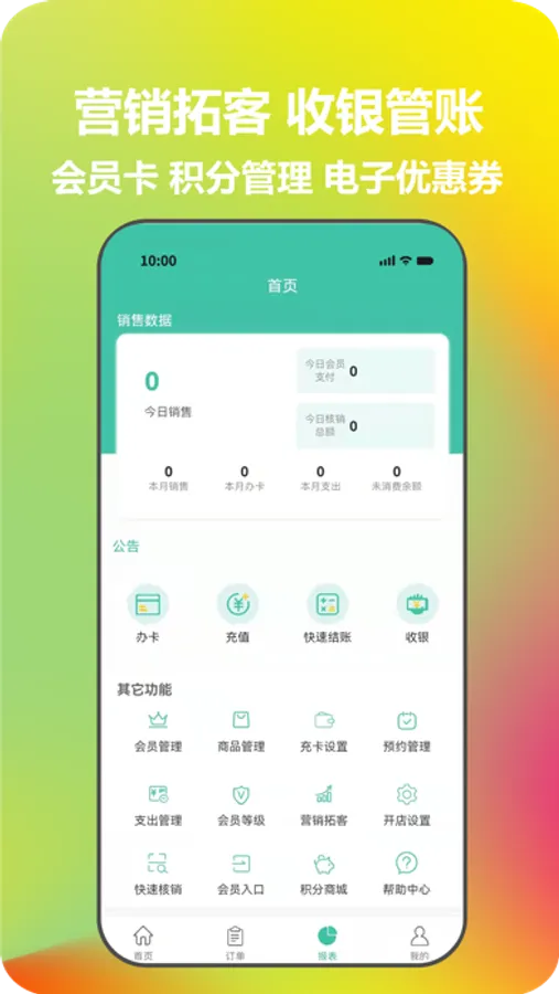 (1)办理会员卡、储值卡、次卡、时长卡(天卡、月卡、年卡),完成各种会员