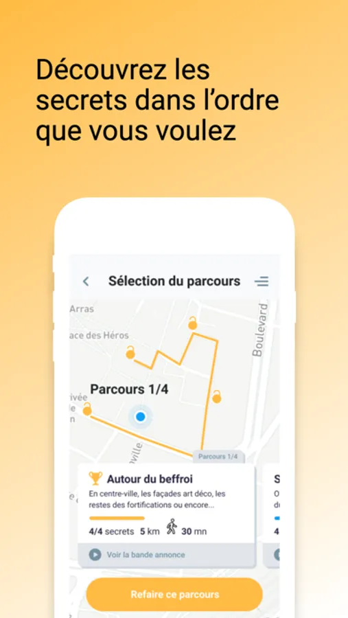 Select the area you are in and go for it! Locks allow you to situate yourself in relation to the secrets. You can access them in any order you wish. A photo clue will help you identify that you are in the right place. About 20 meters from the secret, a notification will indicate that you can access the video. Once you have viewed the video, go and discover the next secret represented by a closed lock.