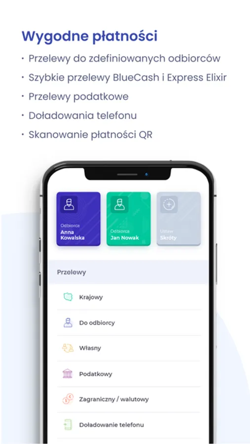 - przelewy do zdefiniowanych odbiorców – podgląd listy, dodawanie i usuwanie odbiorcy