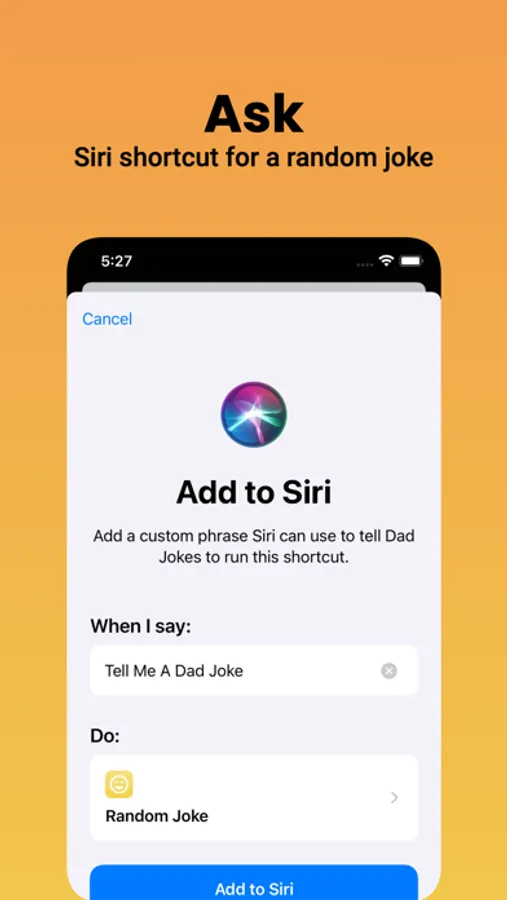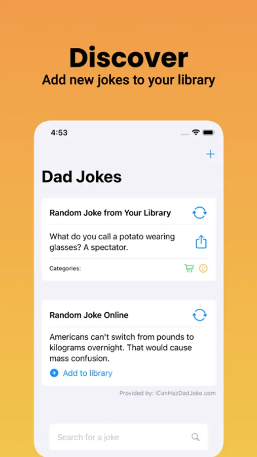 - Discover and add new jokes to your library (provided by icanhazdadjoke.com)