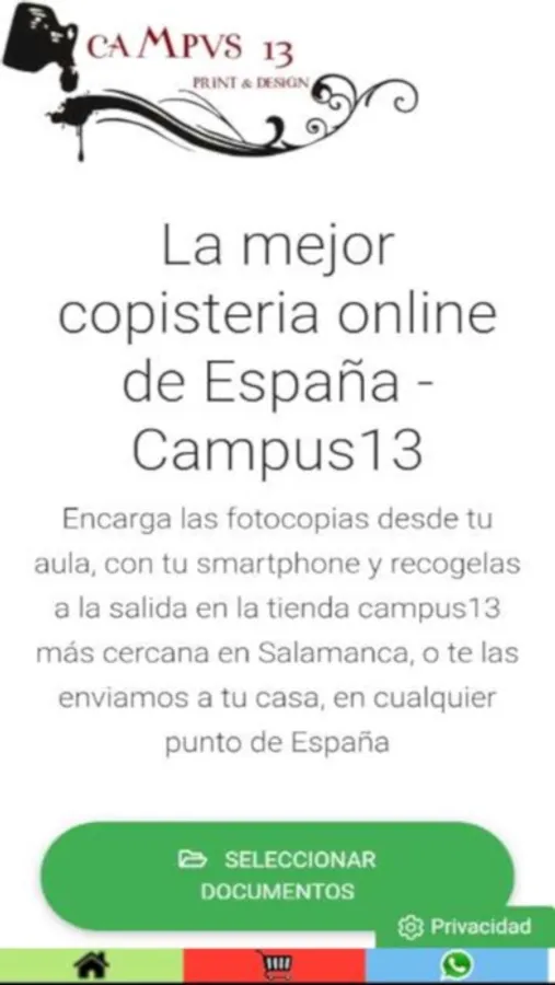 Con la app de Campus13, tendrás una copistería online al alcance de tu mano. Podrás enviarnos para imprimir tus documentos pdf, desde tu aula, trabajo o casa. Desde donde quieras siempre que tengas acceso a internet con tu móvil.
