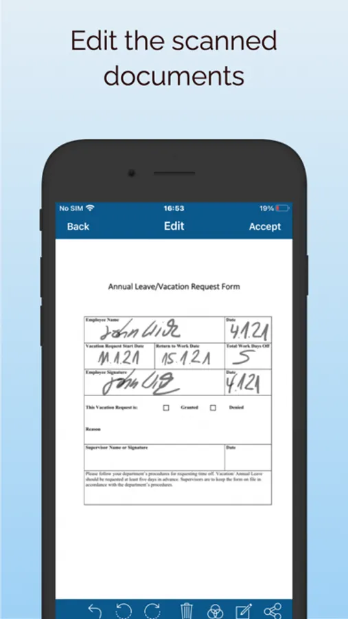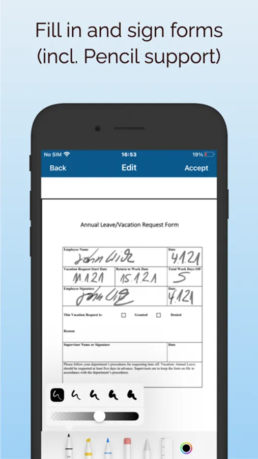Do you have to fill out and sign an application? In the past, a printer was needed to print out digital requests, fill them out, scan them in and send them off. With this app you can easily scan the request or add it from the photo library and fill out/sign it on your device. Afterwards the completed request can be sent away as a PDF or graphic file. You no longer need a printer and/or scanner and the entire process takes only a few minutes. On the iPad, it is going to be a pleasure with the Apple Pencil!
