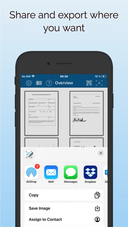 • Share the created file via the Apple-Sharing dialogue (Print, Save, Email, Messenger, AirDrop, Cloud etc.)