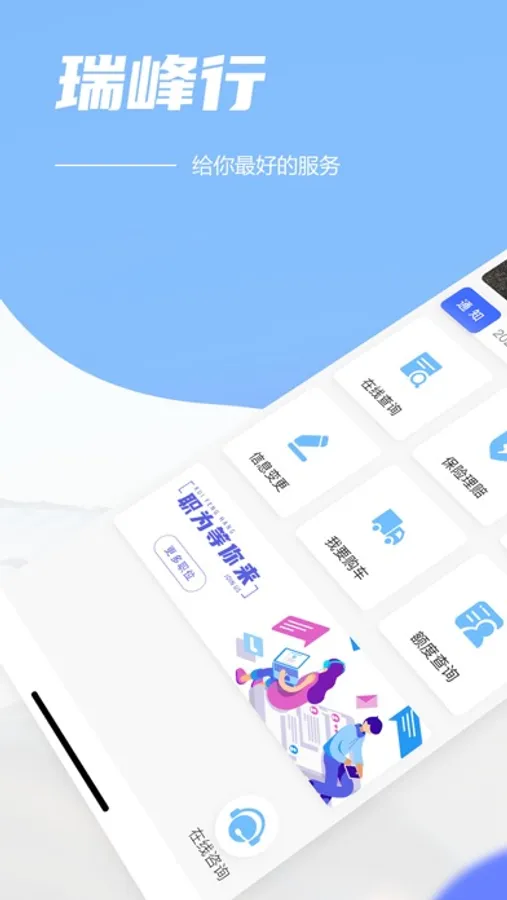 瑞峰行APP, 针对于客户在线快速办理业务, 对业务申请进行进度查询, 提供查询申请, 保险理赔, 结清办理, 信息变更等服务, 将服务标准化、互联网化。