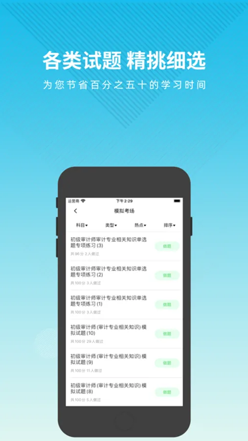 审计师题库APP是一个针对审计师考试的题库软件,涵盖了该考试热点、难点和常考点的考试模拟题库,是您学习和拿高分的好帮手。