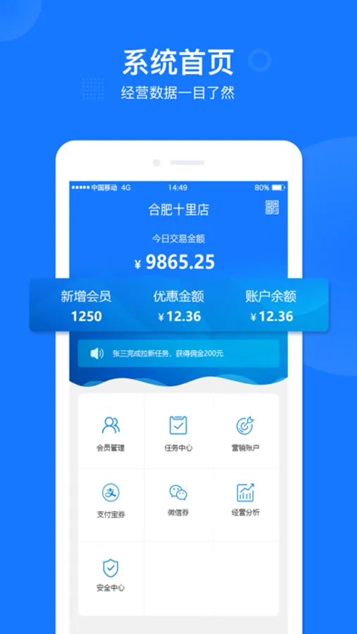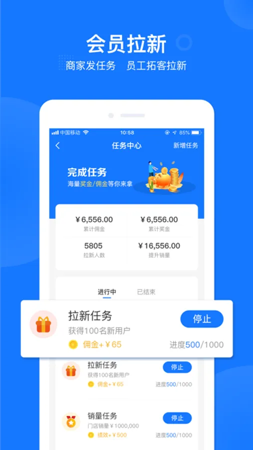 -【任务】任务大厅支持拉新会员任务和门店销售额任何两种形式,通过量化任务指标及清晰的任务进度报表,便于商户更好的掌握员工的绩效及任务的整体进度;