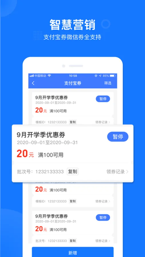 -【卡券】支持微信商家券、代金券,支付宝代金券的创建,支持满减、折扣、换购等卡券类型;