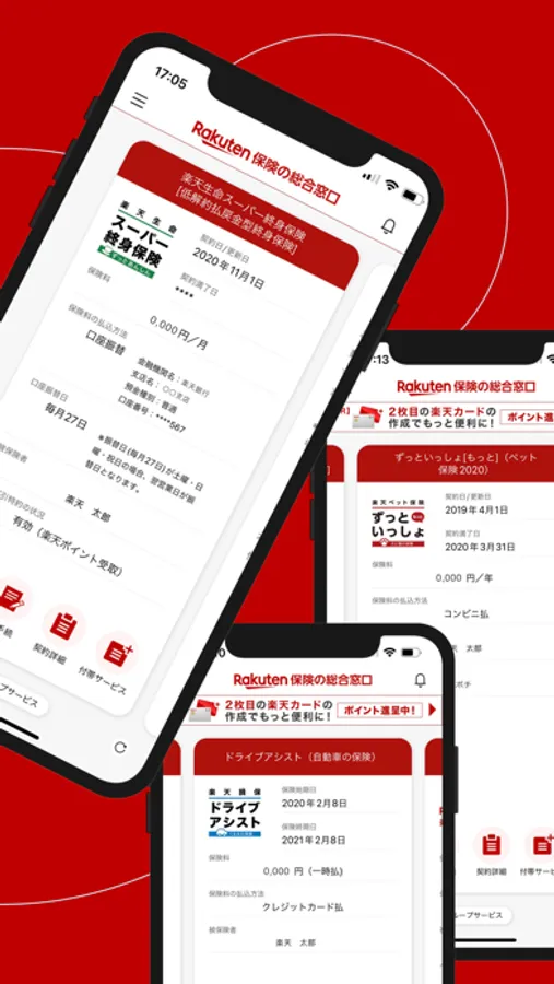楽天生命、楽天損保、楽天ペット保険のご契約内容を「ご契約一覧」で確認できます。
