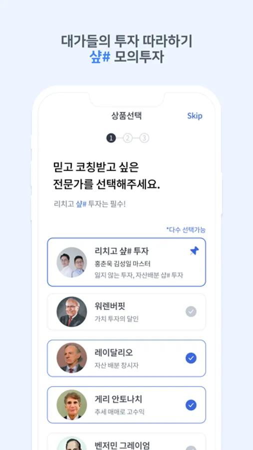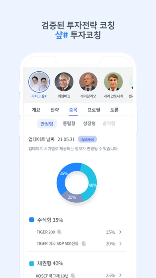 대가들의 투자 전략 쉽게 따라 할 수 있도록, 종목선정, 투자비중, 매매좌수, 코칭 알림까지 친절하게 모두 알려드립니다.