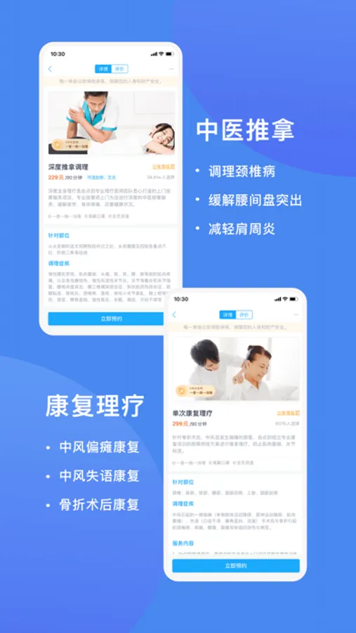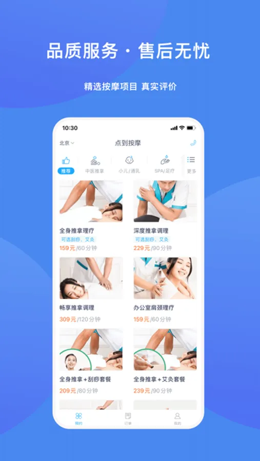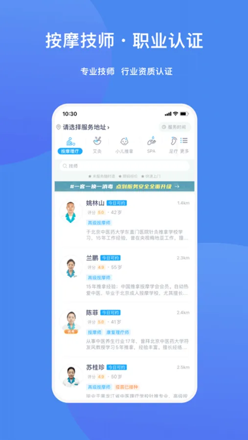 应用特点:满足爱好按摩服务的用户,可以让您在不同城市,不同场所都能体验到标准化的上门按摩服务。