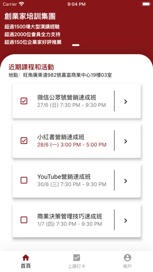 為創業家會員專用的手機程式,最方便快捷的報名課程及簽到功能