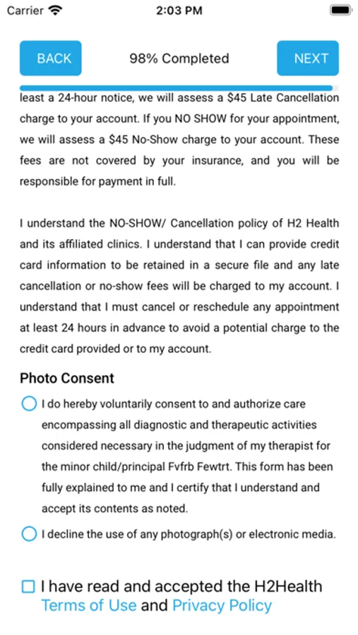 The H2 Health app helps new patients complete all the necessary registration paperwork easily from their mobile devices. The app walks the new patient through each step and captures the necessary information for their first appointment with the therapist saving time and providing accurate information. It eliminates the need for new patients to come to their first appointment very early and take time to fill out paper forms on a clipboard by hand.