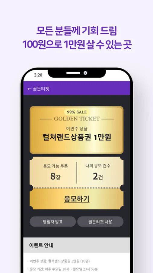 매일매일 진행되는 골든티켓 추첨 이벤트! 조건 없이 응모하고 컬쳐랜드상품권 1만원을 100원에 구매하는 행운을 잡아보세요.