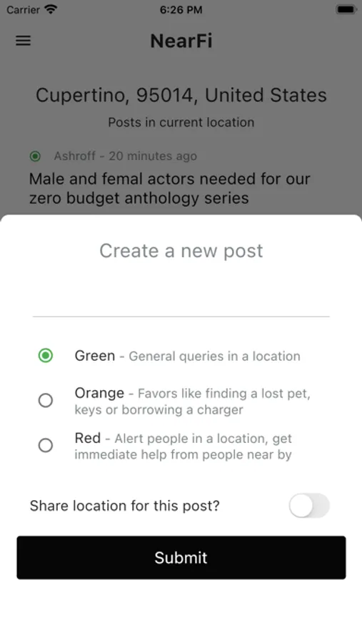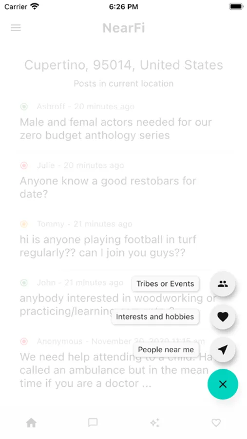 NearFi is a geo-messaging or location based communication tool. NearFi allows you to send a message to people near you in your vicinity, neighborhood and city. Get last minute real time information, help or alerts in a location. You can think of NearFi as a location based Reddit, Twitter and Clubhouse.